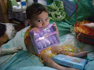 We celebrated many firsts with Sam this year, including first steps - on Mother's Day! (And as soon as he started to walk, there was no stopping him!!!) Sam enjoyed his first Easter, complete with the introduction to peeps... a rite of passage indeed! As you can see, they were a big hit! Charlie is SO patient...