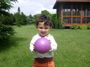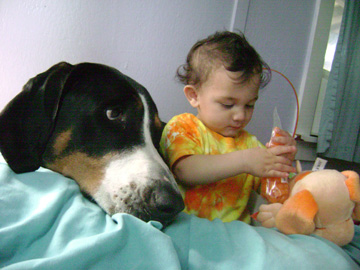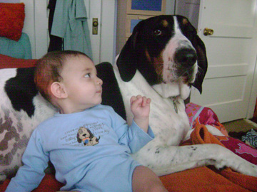Sam is a very active, happy boy who enjoys playing with Charlie, dumping out all his blocks and going down the big slide at the playground. He is fast and fearless with no regard for personal safety! He loves trucks and cars and anything he can push or pull. His favorite book is Goodnight Moon, which we read - at his (sometimes) polite request - no less than four times a day. He's very sweet and affectionate and wakes us up every morning with hugs and kisses!