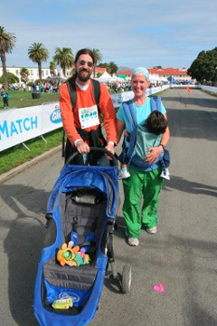 We participated in the annual Bridge to Bridge Run again this year. The 12K run (or walk, in our case) goes from the Bay Bridge to the Golden Gate Bridge and benefits Special Olympics. Stopping for a bottle and a diaper change along the way, I think we were literally the last ones to cross the finish line!! (and Sam didn't quite make it the whole way for this one either!)